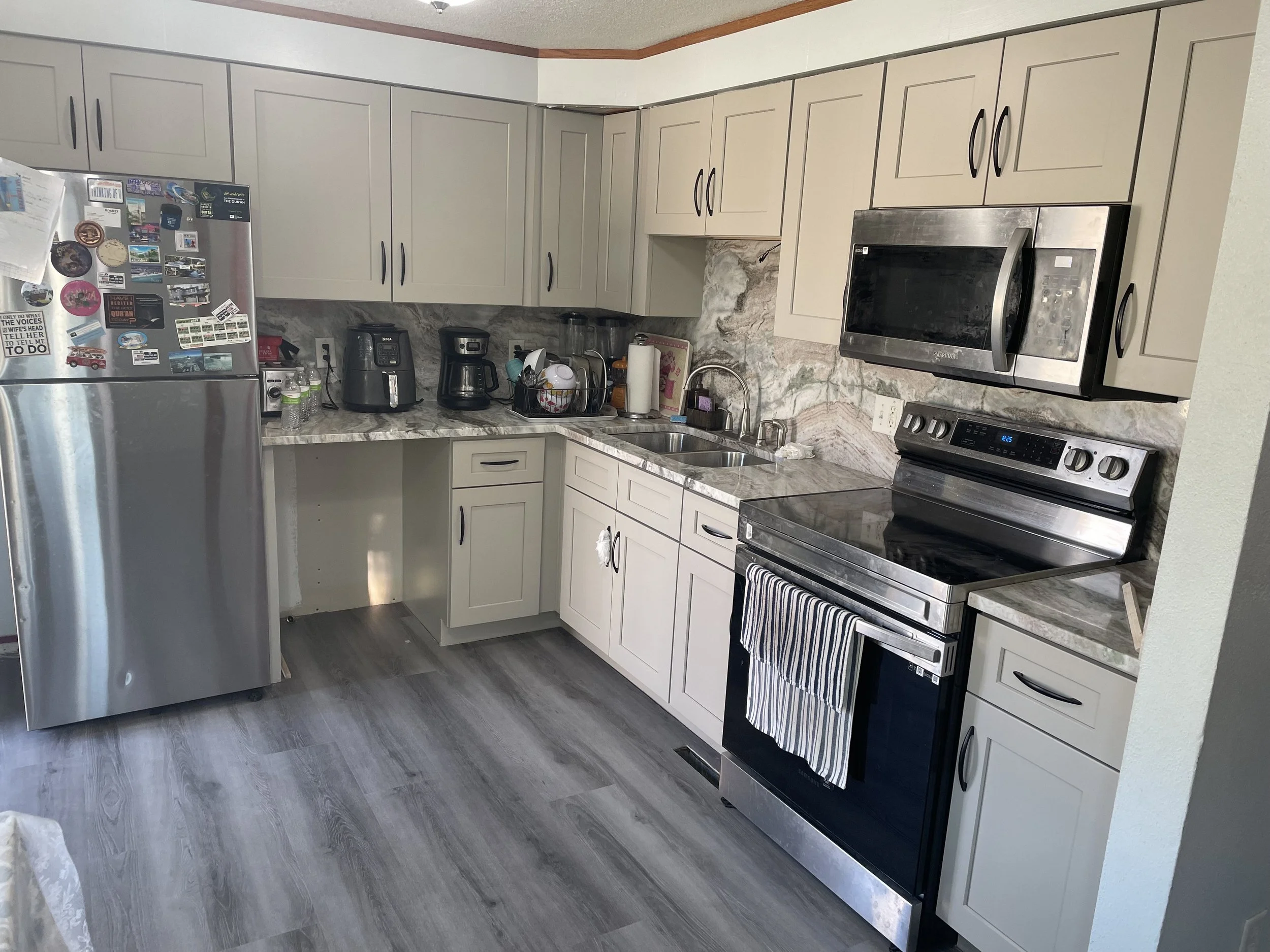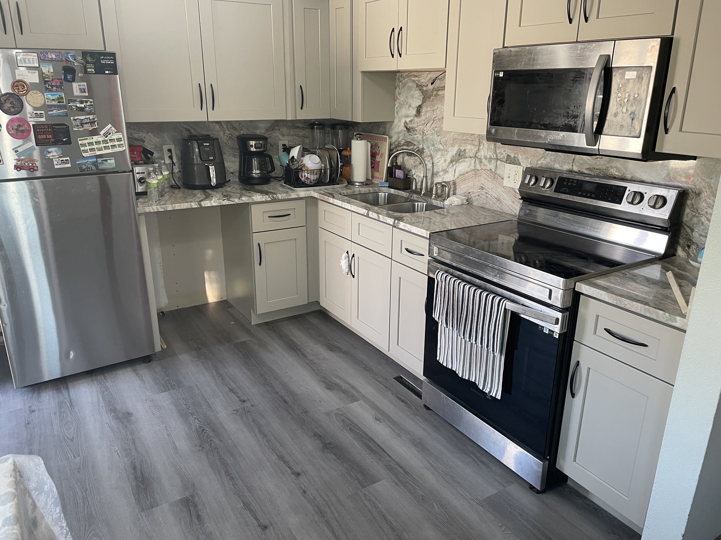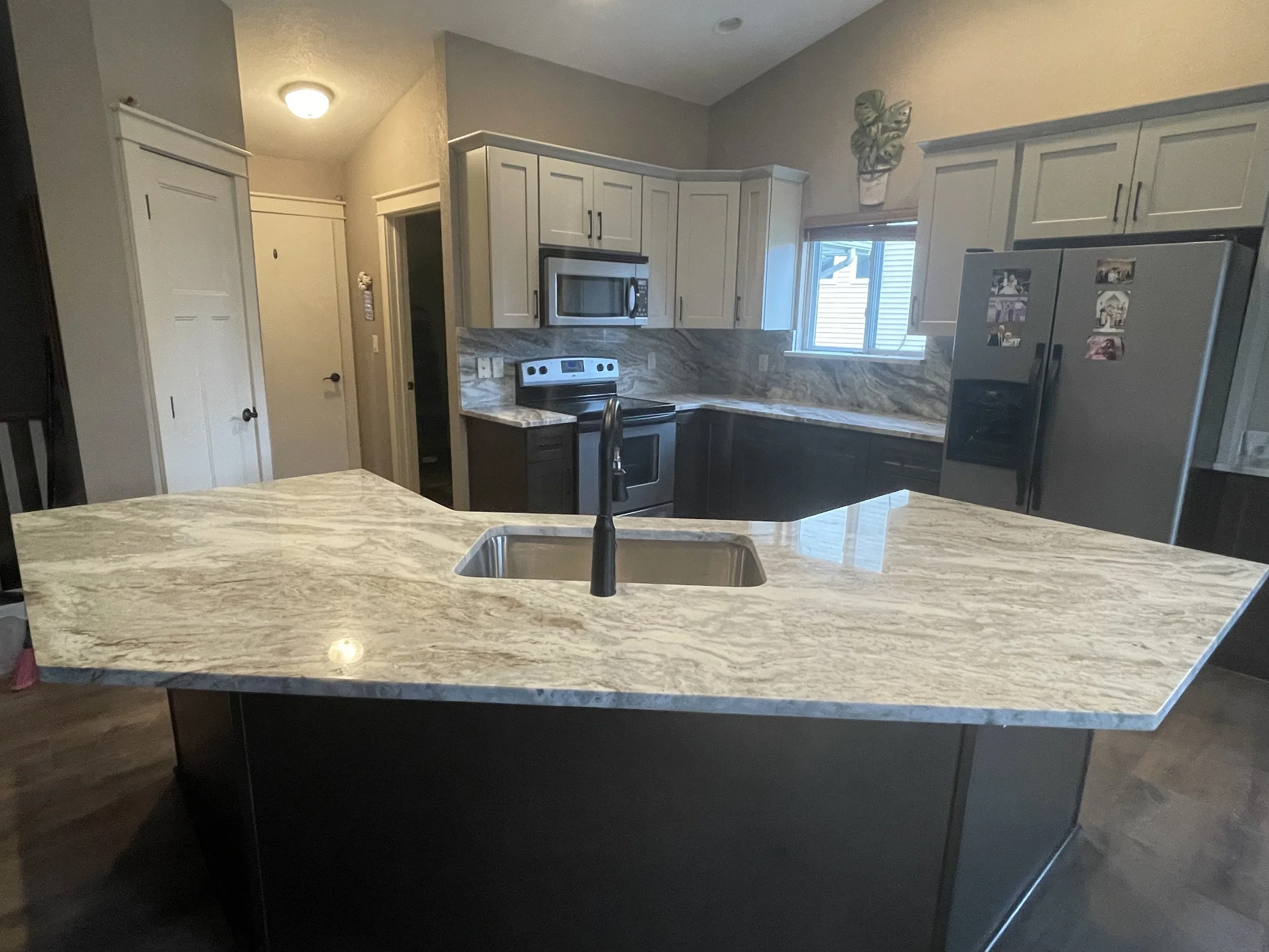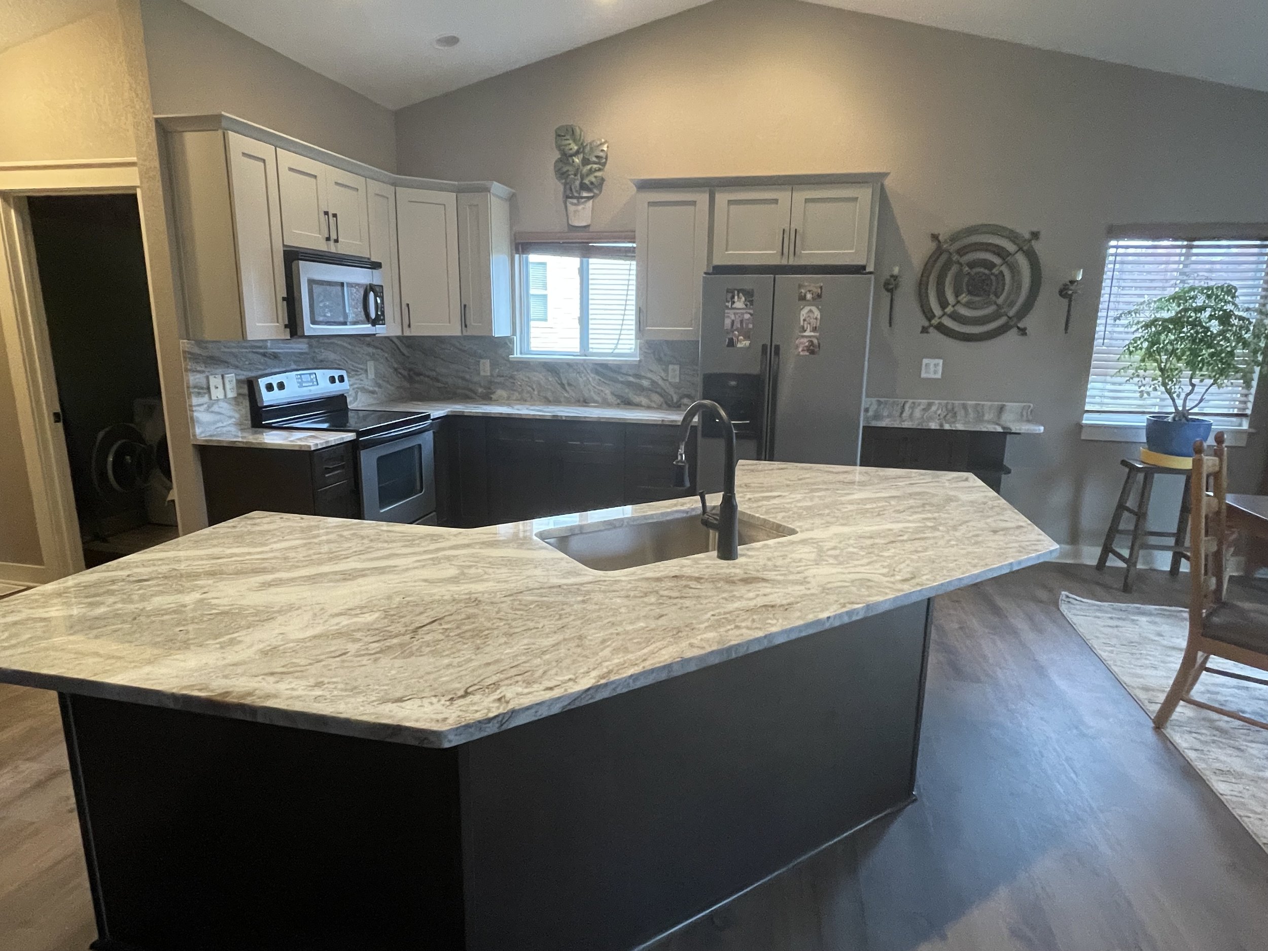 Gallery All Projects Bar Kitchen Bathroom Pantry Living Room Laundry Outdoor Mudroom Office Kitchen CabinetsShaker WhiteCountertopMaterial: QuartzColor: Carrara VeneziaEdge Profile: Eased Details: Bathroom Bar Pantry Living Room Laundry Outdoor Mudroom Office